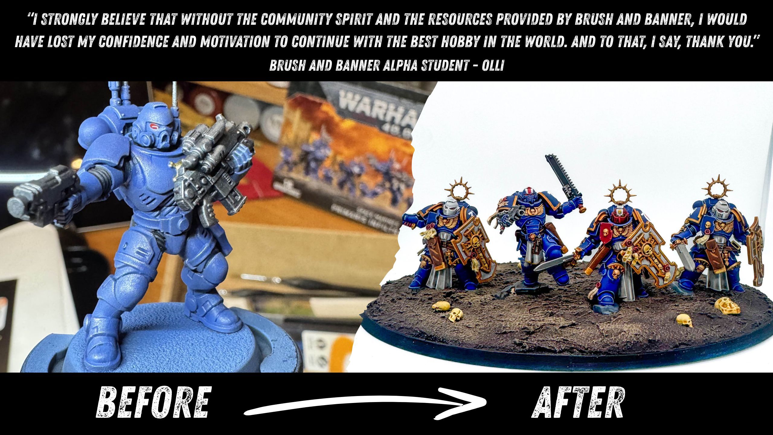 I have about three years painting experience, but Brush & Banner set a path for me to follow. I feel like I've improved greatly in blending, volumetric highlights, and NMM within the past few months just using the tutorials you guys provide. On top of that the community here is something I am lucky and grateful to be a part of!